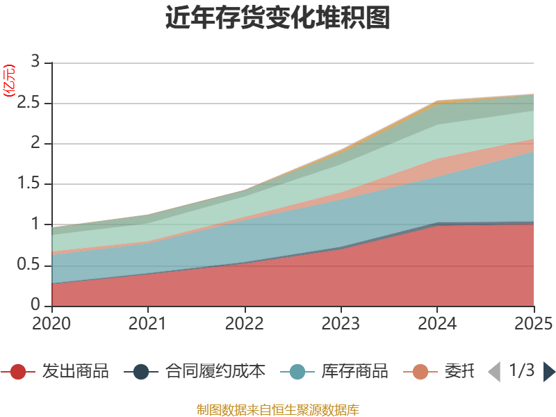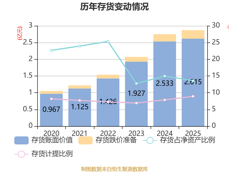 从存货变动来看,截至2025年末,公司存货账面价值为2.62亿元,占净资产的13.56%,较上年末增加818.68万元。其中,存货跌价准备为2560.77万元,计提比例为8.92%。