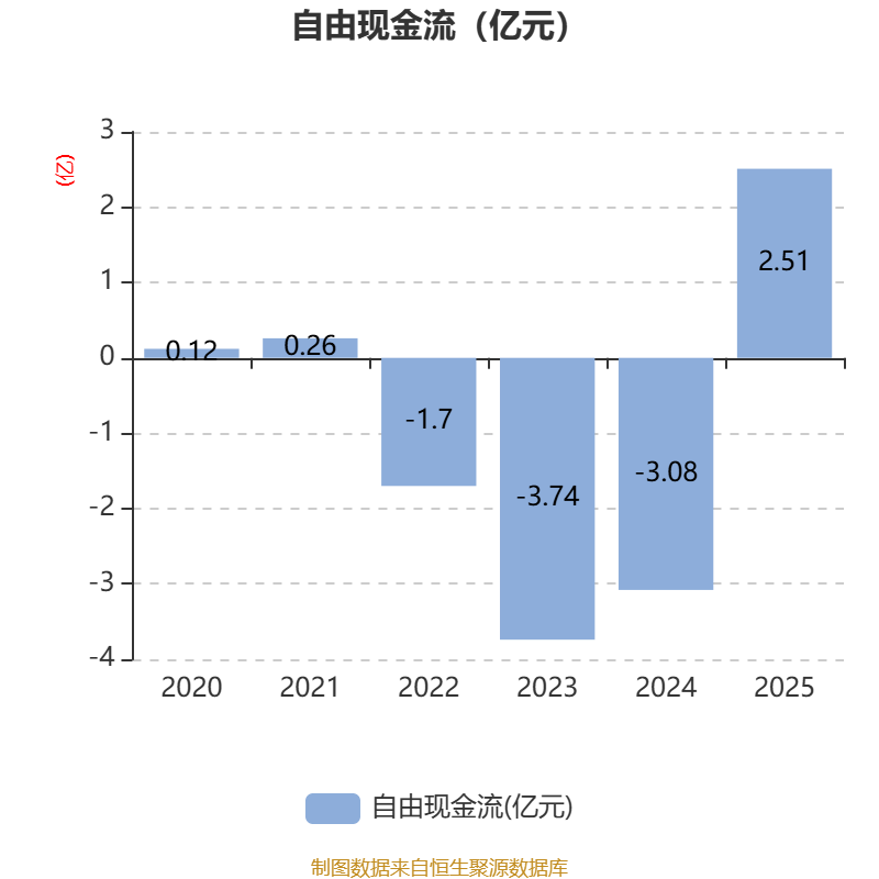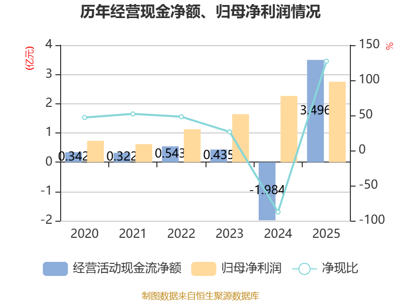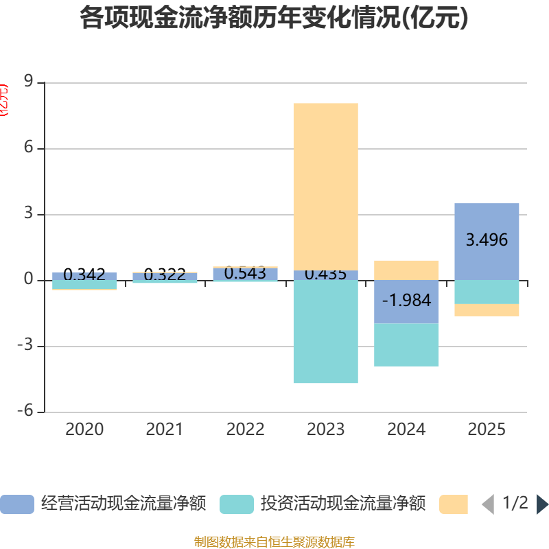 截至2025年,公司经营活动现金流净额为3.5亿元,同比增加5.48亿元;筹资活动现金流净额-5635.16万元,同比减少1.44亿元;投资活动现金流净额-1.09亿元,上年同期为-1.95亿元。
