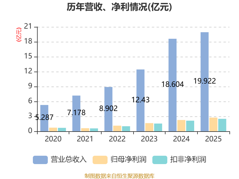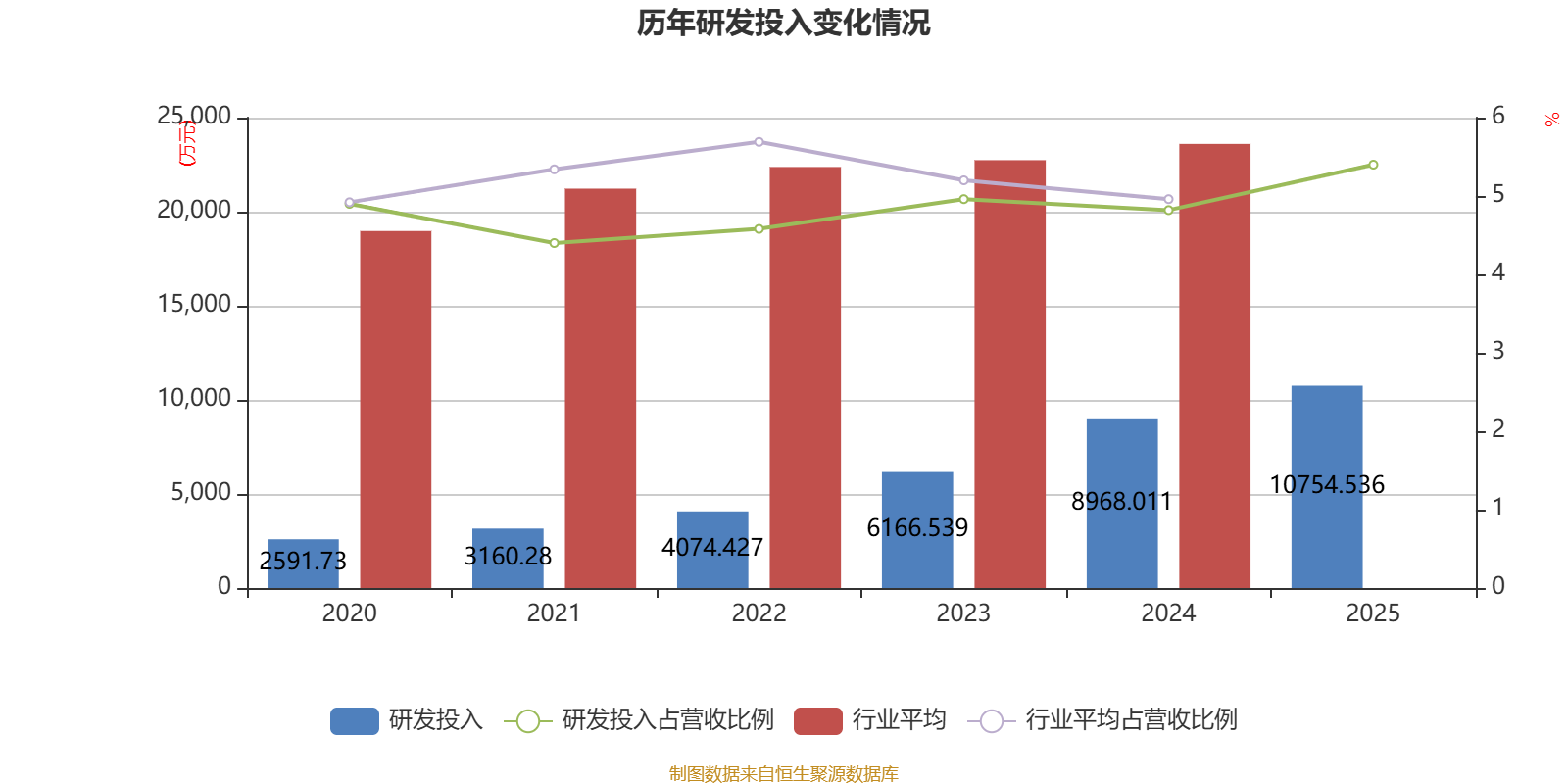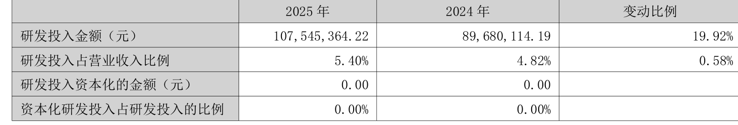 2025年全年,公司研发投入金额为1.08亿元,同比增长19.92%;研发投入占营业收入比例为5.4%,相比上年同期上升0.58个百分点。此外,公司全年研发投入资本化率为0%。