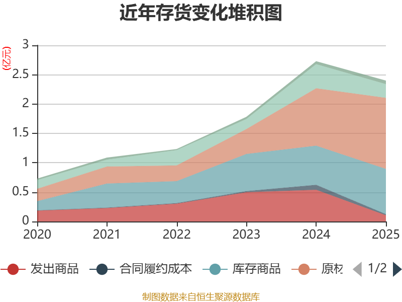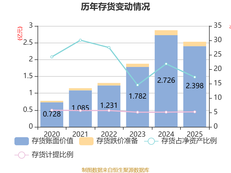 从存货变动来看,截至2025年末,公司存货账面价值为2.4亿元,占净资产的17.26%,较上年末减少3279.42万元。其中,存货跌价准备为1317.31万元,计提比例为5.21%。