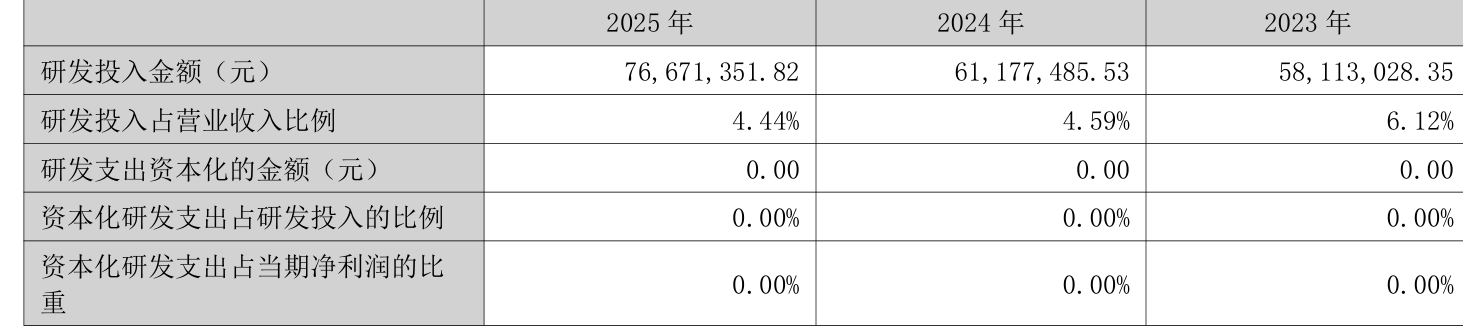 2025年全年,公司研发投入金额为7667.14万元,同比增长25.33%;研发投入占营业收入比例为4.44%,相比上年同期下降0.15个百分点。此外,公司全年研发投入资本化率为0%。