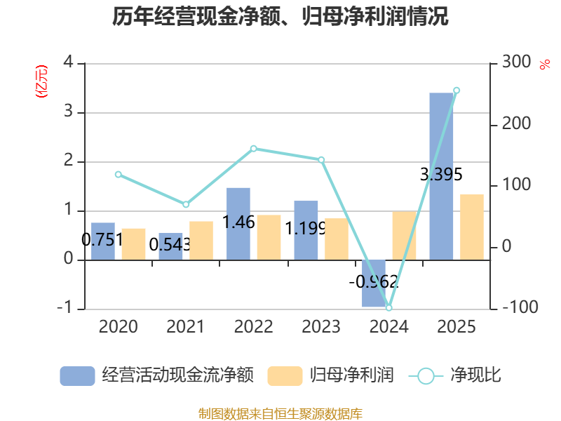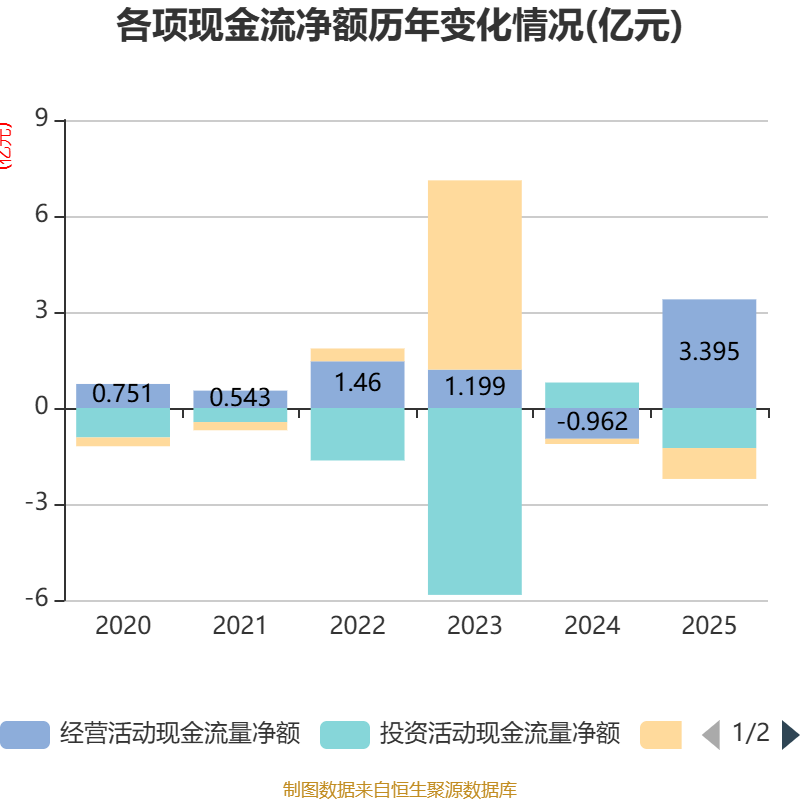截至2025年,公司经营活动现金流净额为3.4亿元,同比增加4.36亿元;筹资活动现金流净额-9662.29万元,同比减少8035.91万元;投资活动现金流净额-1.25亿元,上年同期为7957.9万元。