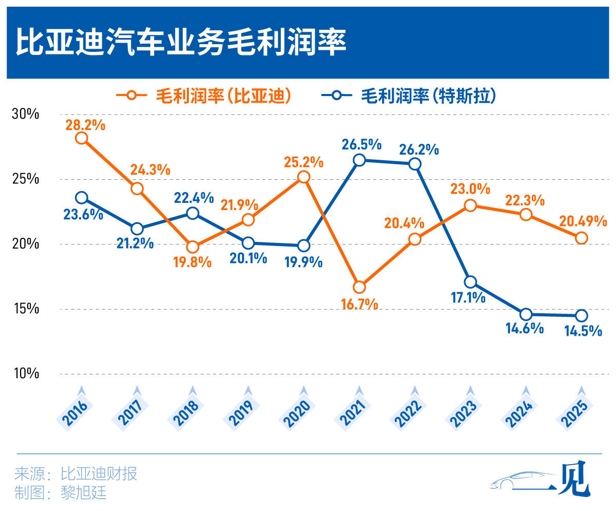 2025年,比亚迪汽车业务毛利率从22.31%降至20.49%。根据财报数据,在不计算所得税前提下,比亚迪的汽车业务利润总额为284亿元,同比2024年的363.32亿元下滑21.78%。按全年销量460万辆计算,比亚迪单车利润约为6174元,同比下滑近三成,2024年这一数字约为8500元。