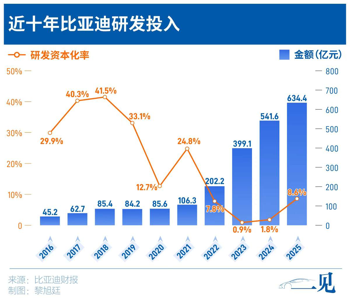 比如2025年,比亚迪研发投入高达634亿元,同比增长17%,研发费用化率达到91.4%,其对应的研发资本化率仅为8.6%。绝大部分研发投入在当期直接计入费用,未来不需要背负大量摊销成本,这也是它“增收不增利”的原因之一,用短期利润换取长期竞争力的战略选择。