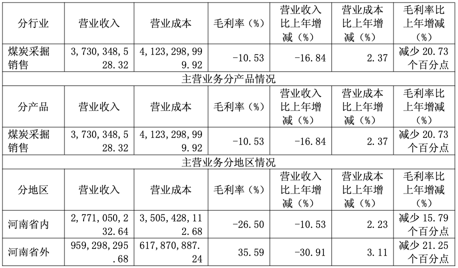 2025年公司主营业务收入37.30亿元,比上年同期减少16.84%,主要是2025年度,公司商品煤平均售价同比下降124.03元/吨,影响收入同比减少133,545.94万元。主要原因是2025年度煤炭行业持续下行以及部分矿井煤质较差,致使煤炭平均售价同比下降幅度较大。