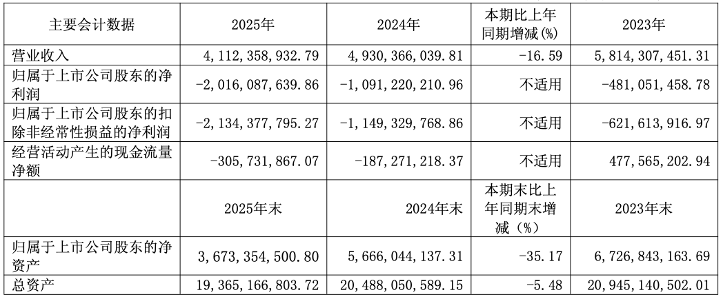 4月2日,大有能源(600403)公布2025年年报,公司营业收入为41.1亿元,同比下降16.6%;归母净利润自去年同期亏损10.9亿元变为亏损20.2亿元,亏损额进一步扩大;扣非归母净利润自去年同期亏损11.5亿元变为亏损21.3亿元,亏损额进一步扩大;经营现金流净额为-3.06亿元,同比下降63.3%。