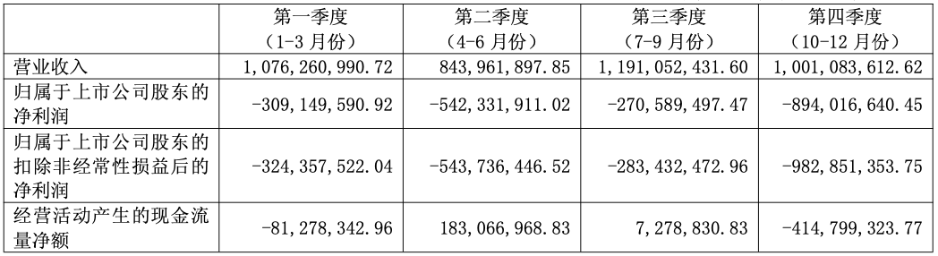 其中第四季度,公司营业收入为10.0亿元,同比下降5.3%;归母净利润自去年同期亏损3.05亿元变为亏损8.94亿元,亏损额进一步扩大;扣非归母净利润自去年同期亏损3.51亿元变为亏损9.83亿元,亏损额进一步扩大。
