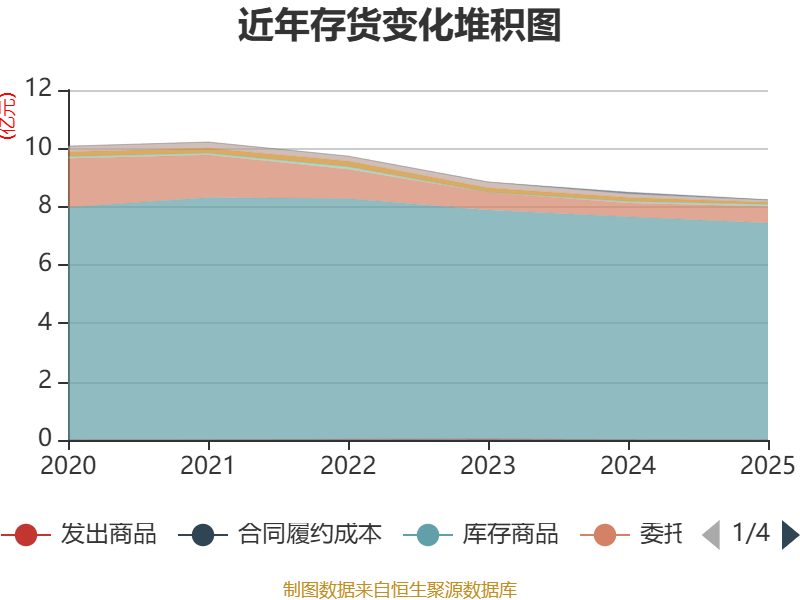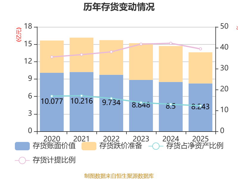 从存货变动来看,截至2025年末,公司存货账面价值为8.24亿元,占净资产的12.22%,较上年末减少2561.97万元。其中,存货跌价准备为5.37亿元,计提比例为39.45%。