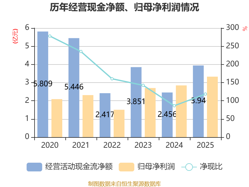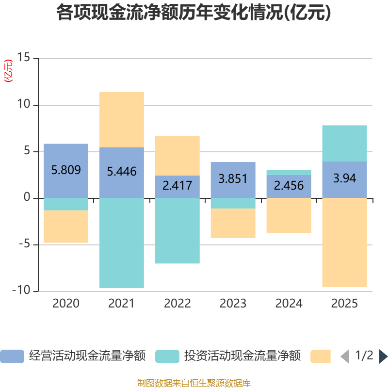 截至2025年,公司经营活动现金流净额为3.94亿元,同比增长60.42%;筹资活动现金流净额-9.58亿元,同比减少5.82亿元;投资活动现金流净额3.85亿元,上年同期为5396.68万元。