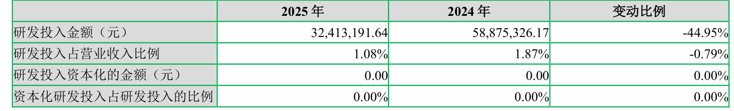 2025年全年,公司研发投入金额为3241.32万元,同比下降44.95%;研发投入占营业收入比例为1.08%,相比上年同期下降0.79个百分点。此外,公司全年研发投入资本化率为0%。
