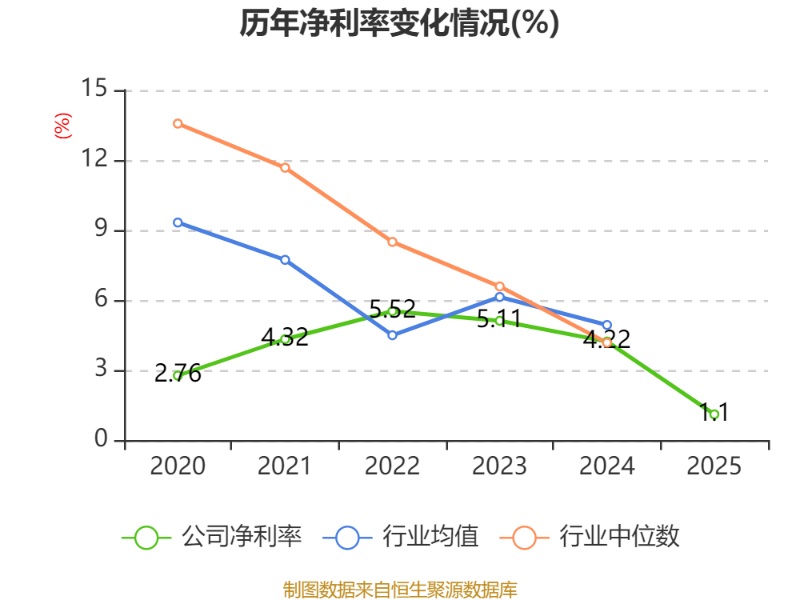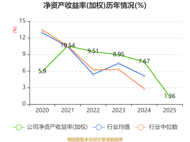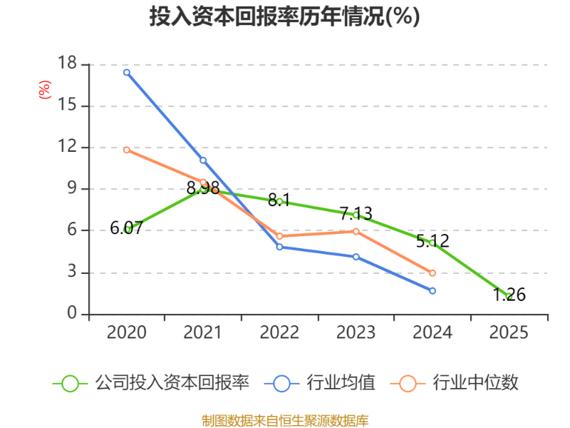 数据显示,2025年公司加权平均净资产收益率为1.36%,较上年同期下降6.31个百分点。公司2025年投入资本回报率为1.26%,较上年同期下降3.86个百分点。