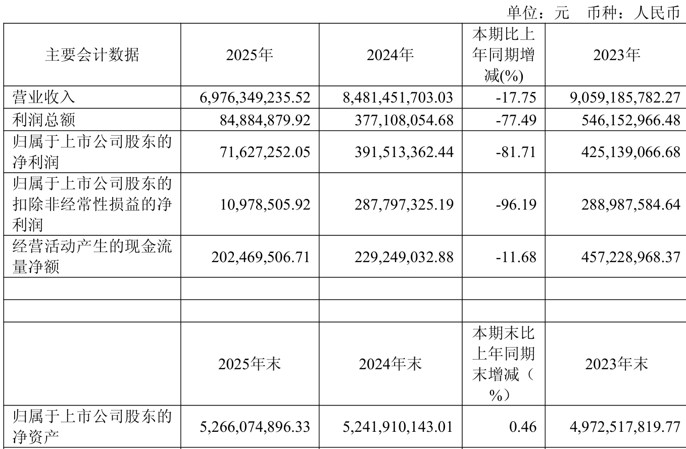 中证智能财讯华建集团(600629)4月3日披露2025年年度报告。2025年,公司实现营业总收入69.76亿元,同比下降17.75%;归母净利润7162.73万元,同比下降81.71%;扣非净利润1097.85万元,同比下降96.19%;经营活动产生的现金流量净额为2.02亿元,同比下降11.68%;报告期内,华建集团基本每股收益为0.07元,加权平均净资产收益率为1.36%。公司2025年度分配预案为:拟向全体股东每10股转2股,派现0.23元(含税)。