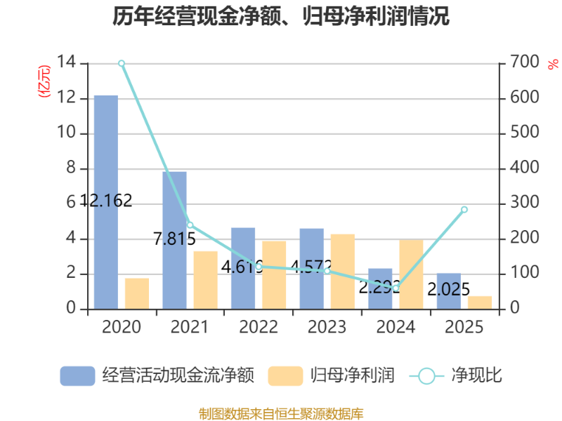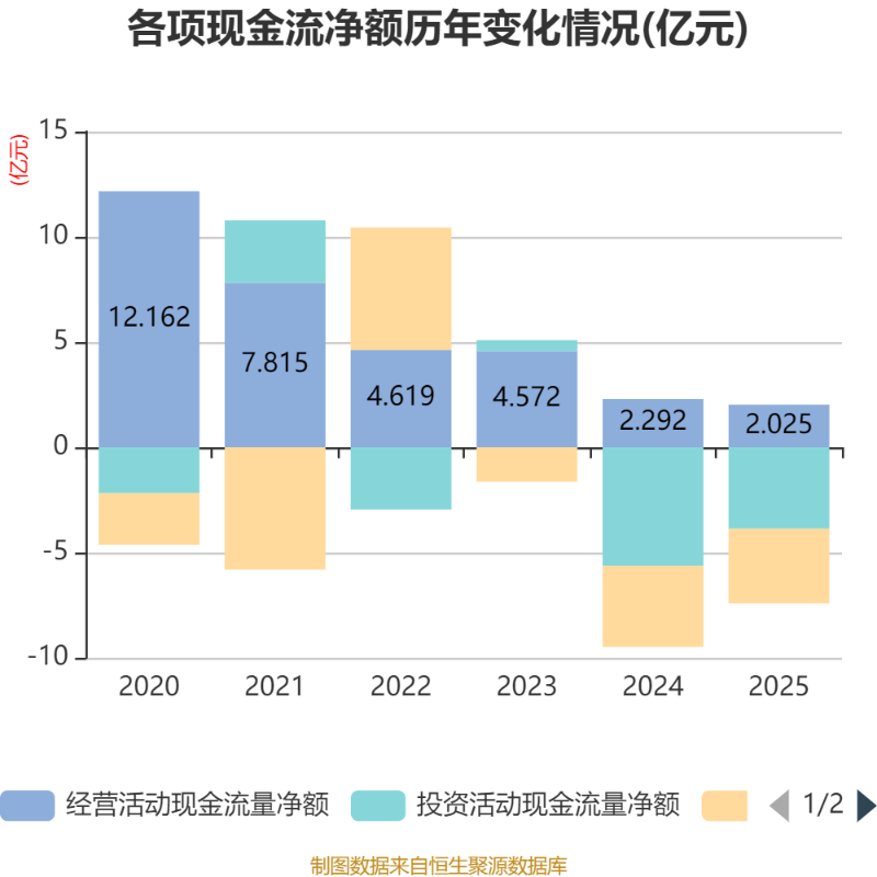 截至2025年,公司经营活动现金流净额为2.02亿元,同比下降11.68%;筹资活动现金流净额-3.55亿元,同比增加3101.27万元;投资活动现金流净额-3.87亿元,上年同期为-5.63亿元。