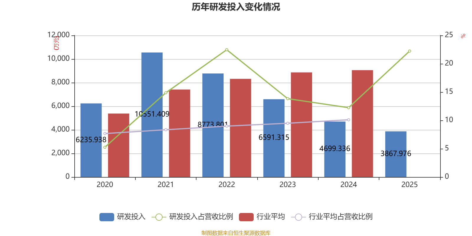 2025年全年,公司研发投入金额为3867.98万元,同比下降17.69%;研发投入占营业收入比例为22.24%,相比上年同期上升10个百分点。此外,公司全年研发投入资本化率为0%。