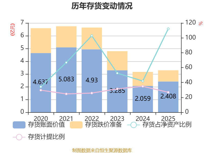 从存货变动来看,截至2025年末,公司存货账面价值为2.41亿元,占净资产的112.1%,较上年末增加3493.64万元。其中,存货跌价准备为8804.27万元,计提比例为26.77%。