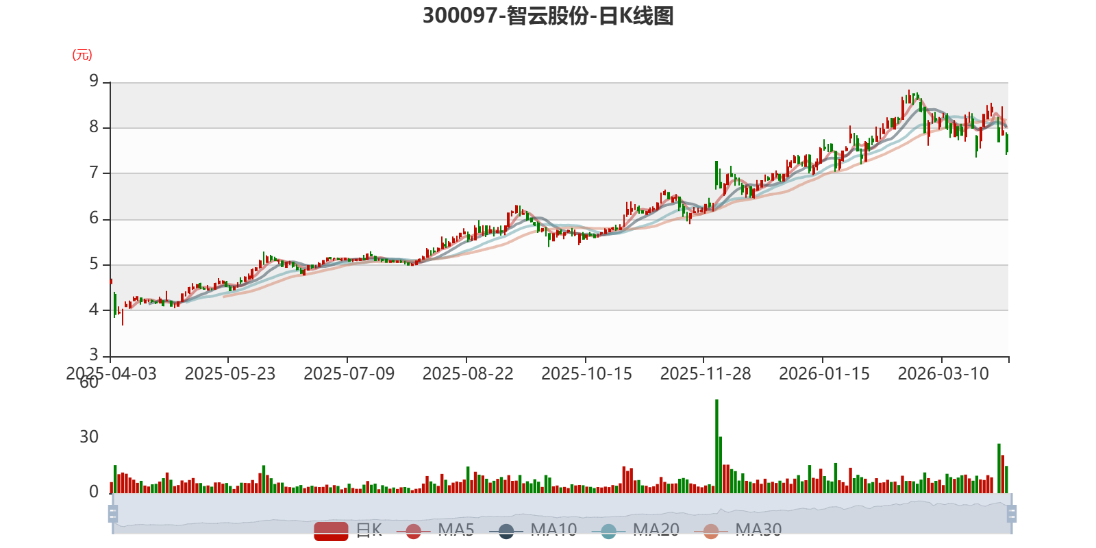值得注意的是,中登公司数据显示,截至2026年3月27日,智云股份12.63%股份处于质押状态。年报显示,第一大股东师利全质押4900万股公司股份,占其全部持股的198.32%;第七大股东胡争光质押443万股公司股份,占其全部持股的100%。