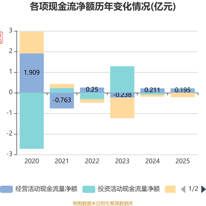 截至2025年,公司经营活动现金流净额为1952.08万元,同比下降7.44%;筹资活动现金流净额-2171.07万元,同比减少1106.67万元;投资活动现金流净额293万元,上年同期为-883.29万元。