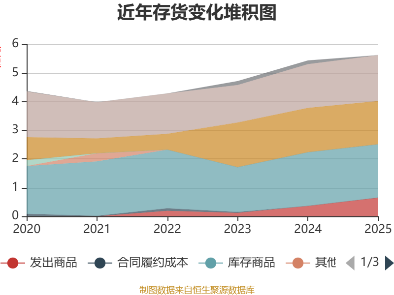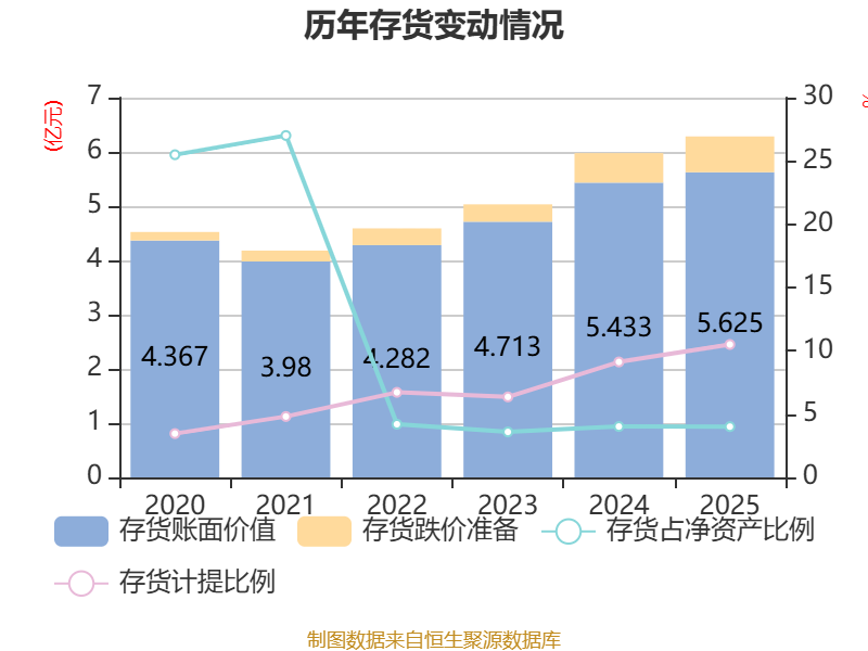 从存货变动来看,截至2025年末,公司存货账面价值为5.62亿元,占净资产的4.01%,较上年末增加1914.18万元。其中,存货跌价准备为6598.12万元,计提比例为10.5%。