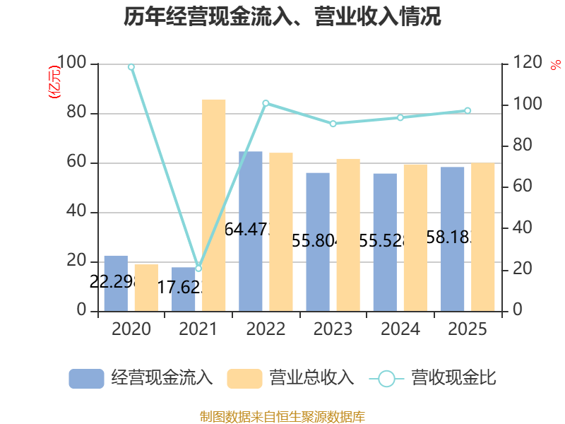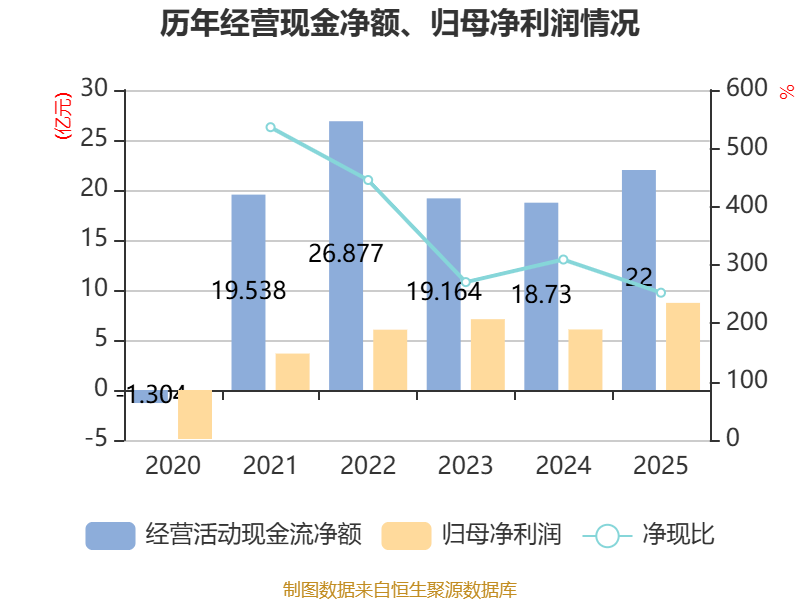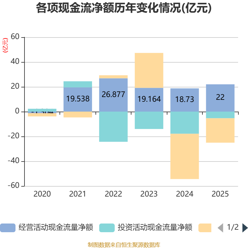 截至2025年,公司经营活动现金流净额为22亿元,同比增长17.46%;筹资活动现金流净额-19.68亿元,同比增加16.84亿元;投资活动现金流净额-5.39亿元,上年同期为-17.88亿元。