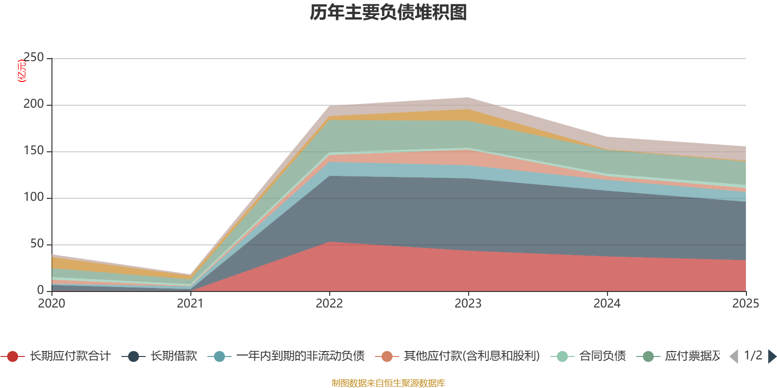 负债重大变化方面,截至2025年末,公司长期借款较上年末减少11.13%,占公司总资产比重下降2.21个百分点;长期应付款合计较上年末减少10.81%,占公司总资产比重下降1.12个百分点;预计负债较上年末增加27.73%,占公司总资产比重上升0.59个百分点;一年内到期的非流动负债较上年末减少8.74%,占公司总资产比重下降0.27个百分点。