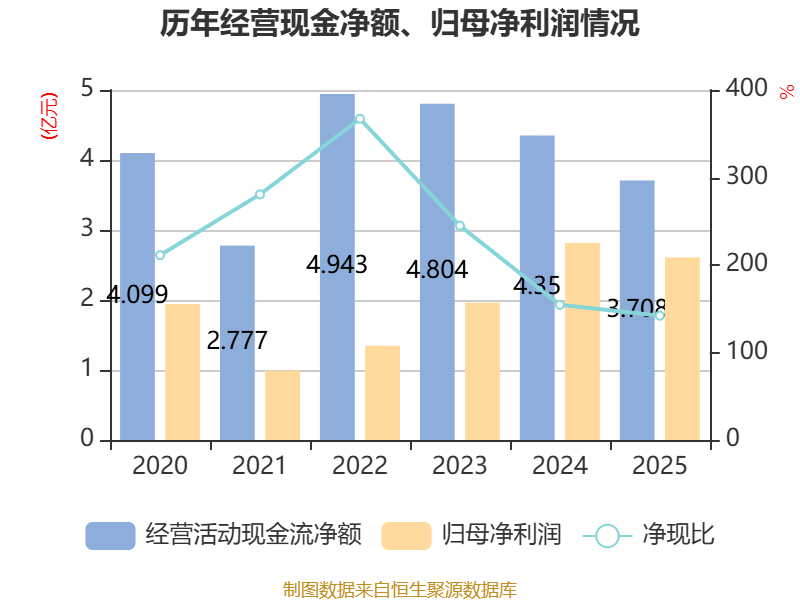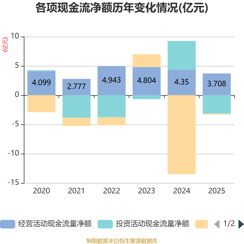 截至2025年,公司经营活动现金流净额为3.71亿元,同比下降14.76%;筹资活动现金流净额-1549.08万元,同比增加13.33亿元;投资活动现金流净额-3.15亿元,上年同期为4.9亿元。