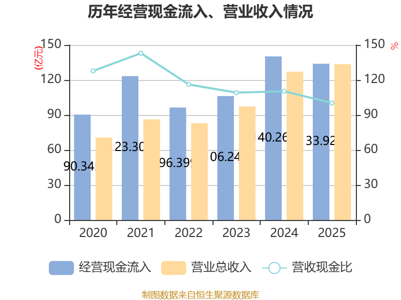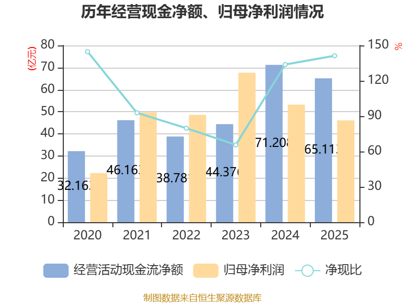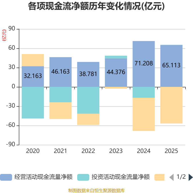 截至2025年,公司经营活动现金流净额为65.11亿元,同比下降8.56%;筹资活动现金流净额-56.95亿元,同比减少5.32亿元;投资活动现金流净额2761.56万元,上年同期为-16.88亿元。