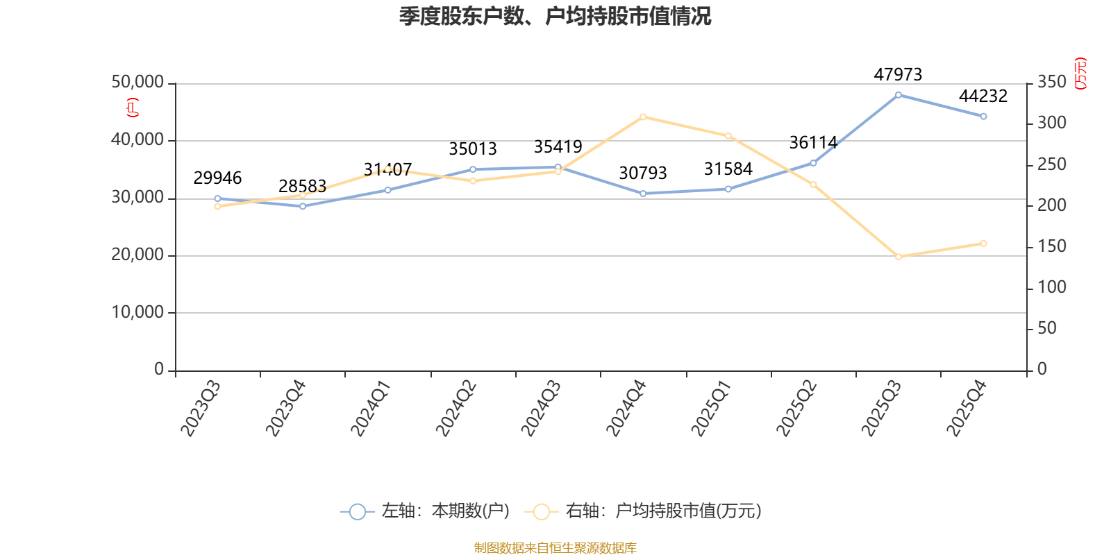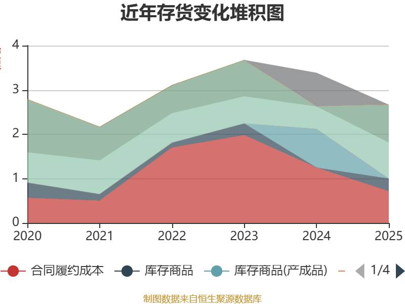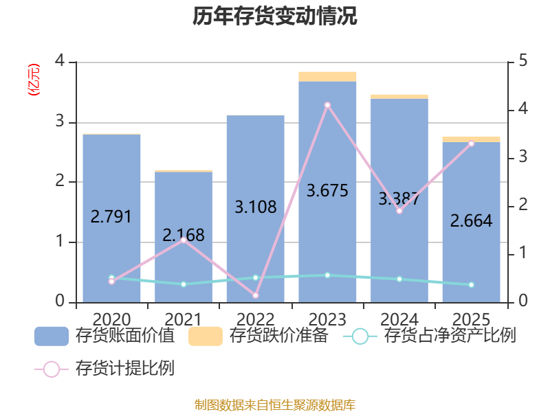 从存货变动来看,截至2025年末,公司存货账面价值为2.66亿元,占净资产的0.36%,较上年末减少7228.91万元。其中,存货跌价准备为910.37万元,计提比例为3.3%。