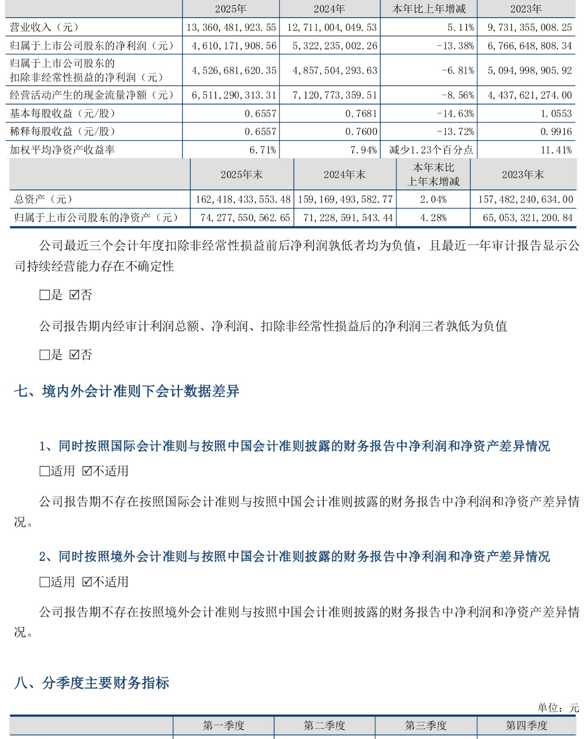 中证智能财讯招商公路(001965)4月3日披露2025年年度报告。2025年,公司实现营业总收入133.60亿元,同比增长5.11%;归母净利润46.10亿元,同比下降13.38%;扣非净利润45.27亿元,同比下降6.81%;经营活动产生的现金流量净额为65.11亿元,同比下降8.56%;报告期内,招商公路基本每股收益为0.6557元,加权平均净资产收益率为6.71%。公司2025年度分配预案为:拟向全体股东每10股派现3.73元(含税)。