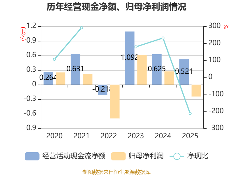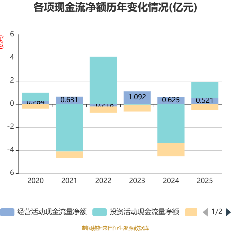 截至2025年,公司经营活动现金流净额为5214.82万元,同比下降16.53%;筹资活动现金流净额-5178.4万元,同比增加6285.28万元;投资活动现金流净额1.36亿元,上年同期为-3.38亿元。