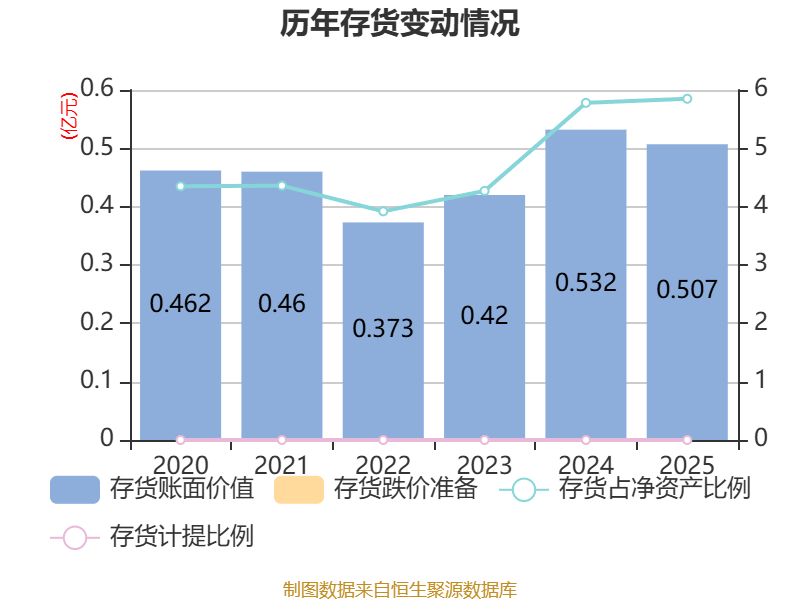 从存货变动来看,截至2025年末,公司存货账面价值为5069.37万元,占净资产的5.85%,较上年末减少251.55万元。公司本期没有计提存货跌价准备。