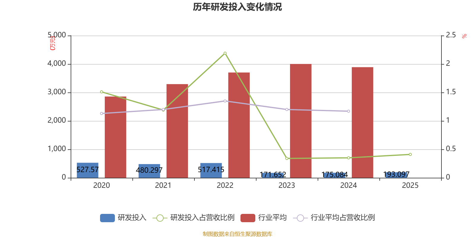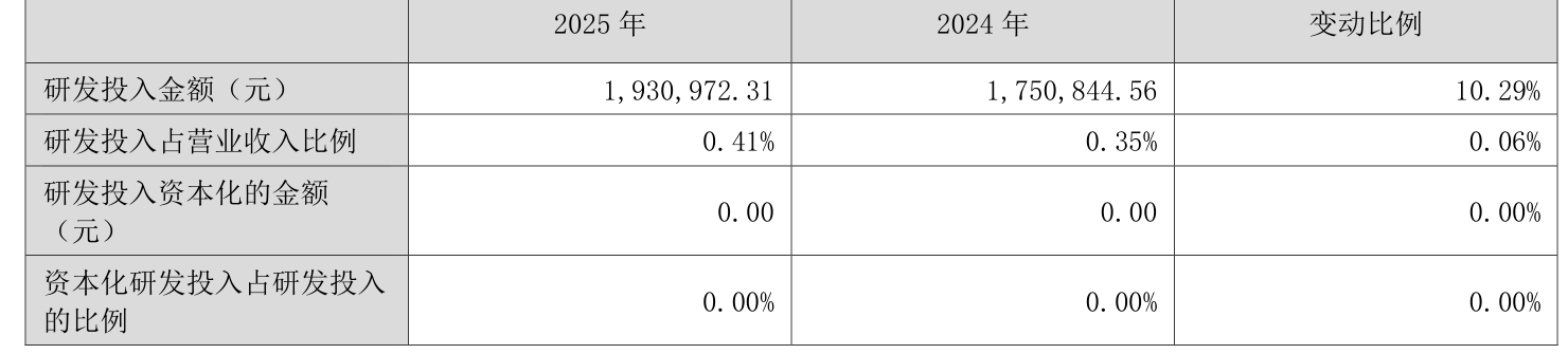2025年全年,公司研发投入金额为193.1万元,同比增长10.29%;研发投入占营业收入比例为0.41%,相比上年同期上升0.06个百分点。此外,公司全年研发投入资本化率为0%。