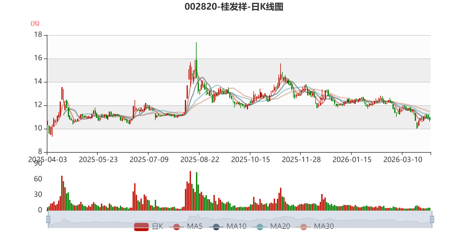 中证智能财讯桂发祥(002820)4月3日披露2025年年度报告。2025年,公司实现营业总收入4.71亿元,同比下降4.93%;归母净利润亏损2452.53万元,上年同期盈利2707.3万元;扣非净利润亏损2518.04万元,上年同期盈利2441.91万元;经营活动产生的现金流量净额为5214.82万元,同比下降16.53%;报告期内,桂发祥基本每股收益为-0.13元,加权平均净资产收益率为-2.75%。公司2025年度分配预案为:拟向全体股东每10股派现1.5元(含税)。