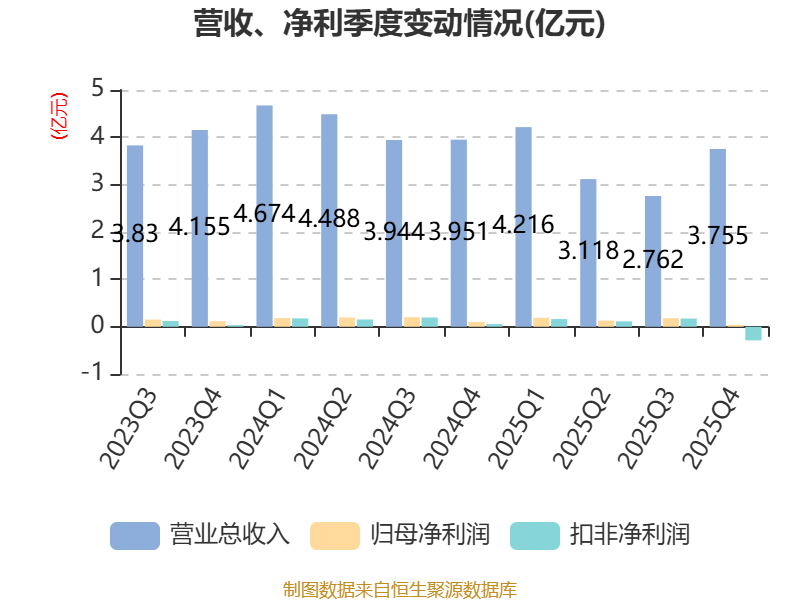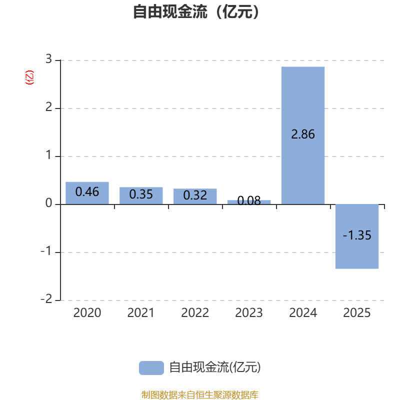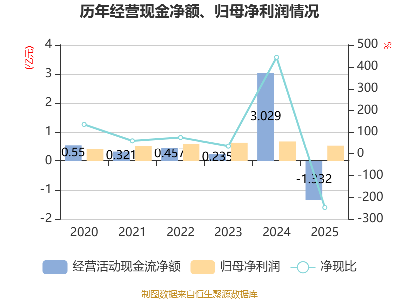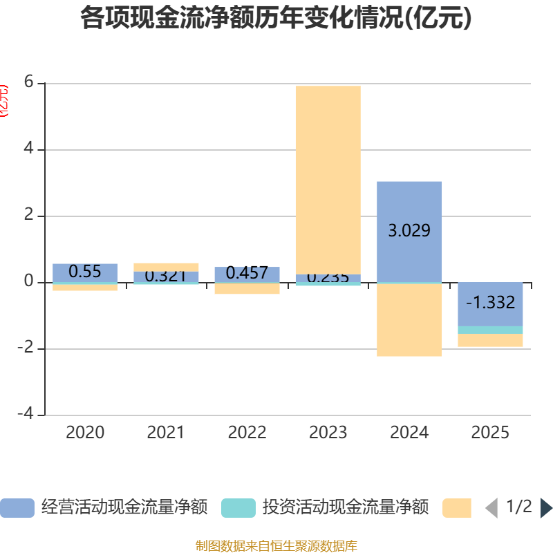截至2025年,公司经营活动现金流净额为-1.33亿元,同比减少4.36亿元;筹资活动现金流净额-3889.85万元,同比增加1.79亿元;投资活动现金流净额-2300.9万元,上年同期为-577.52万元。