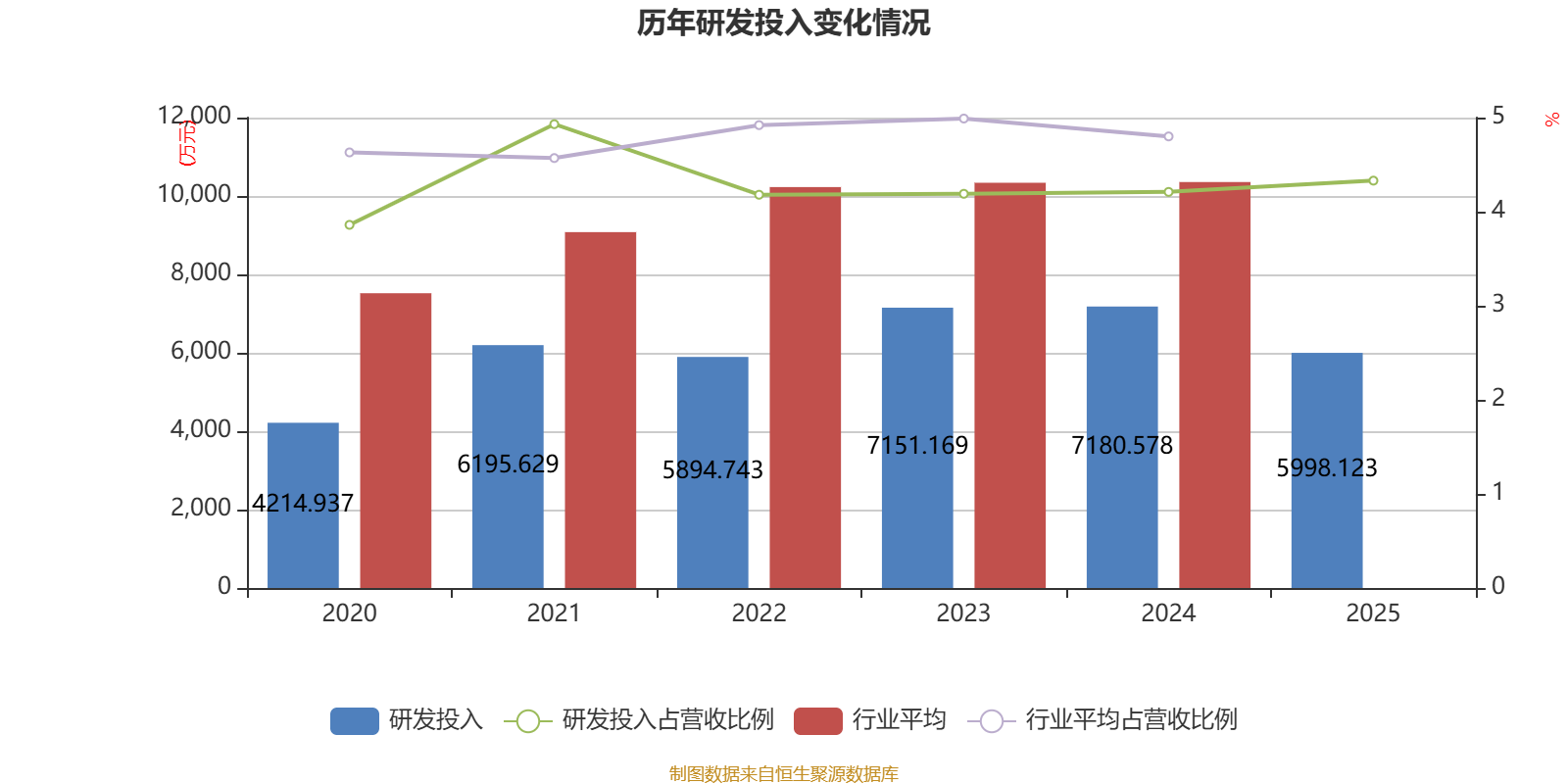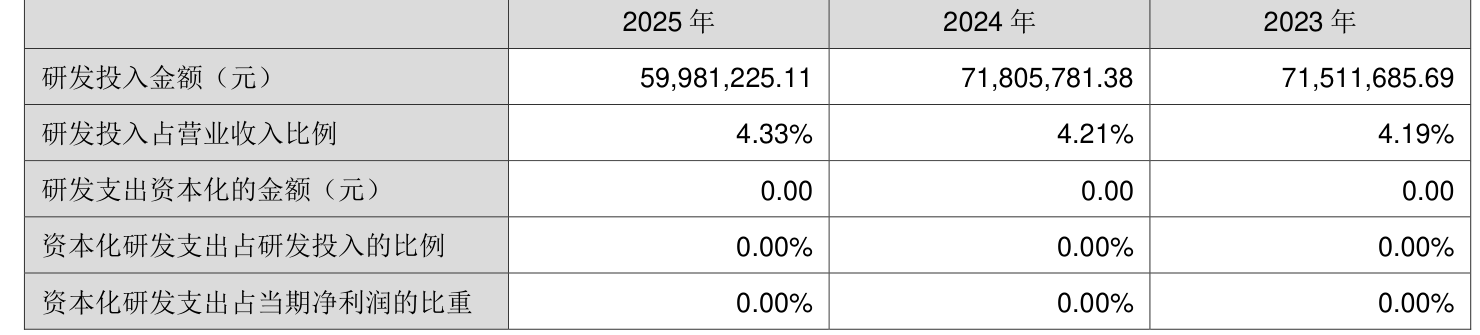 2025年全年,公司研发投入金额为5998.12万元,同比下降16.47%;研发投入占营业收入比例为4.33%,相比上年同期上升0.12个百分点。此外,公司全年研发投入资本化率为0%。