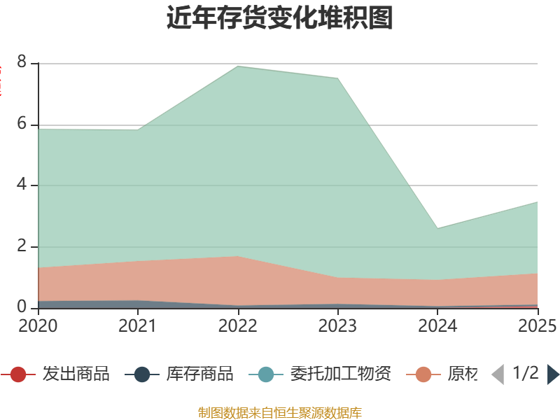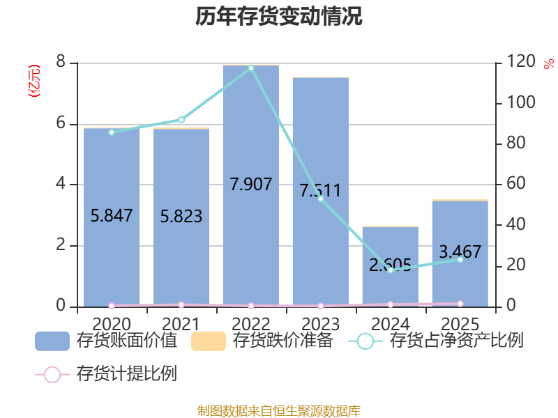 从存货变动来看,截至2025年末,公司存货账面价值为3.47亿元,占净资产的23.11%,较上年末增加8619.39万元。其中,存货跌价准备为491.12万元,计提比例为1.4%。