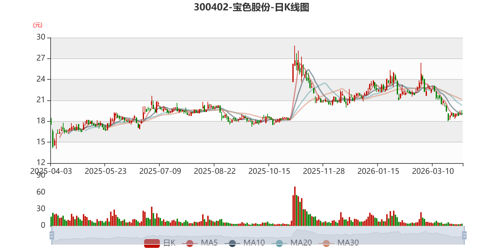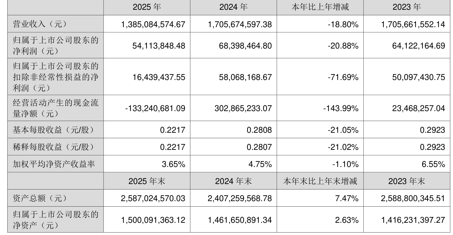 中证智能财讯宝色股份(300402)4月3日披露2025年年度报告。2025年,公司实现营业总收入13.85亿元,同比下降18.80%;归母净利润5411.38万元,同比下降20.88%;扣非净利润1643.94万元,同比下降71.69%;经营活动产生的现金流量净额为-1.33亿元,上年同期为3.03亿元;报告期内,宝色股份基本每股收益为0.2217元,加权平均净资产收益率为3.65%。公司2025年度分配预案为:拟向全体股东每10股派现0.7元(含税)。