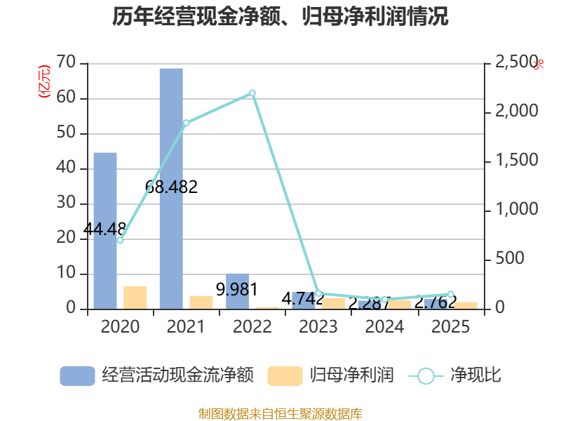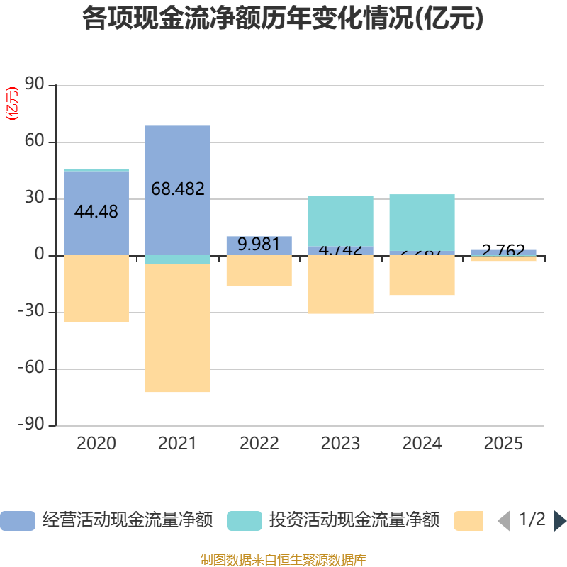 截至2025年,公司经营活动现金流净额为2.76亿元,同比增长20.8%;筹资活动现金流净额-2.47亿元,同比增加18.58亿元;投资活动现金流净额-5938.13万元,上年同期为29.93亿元。