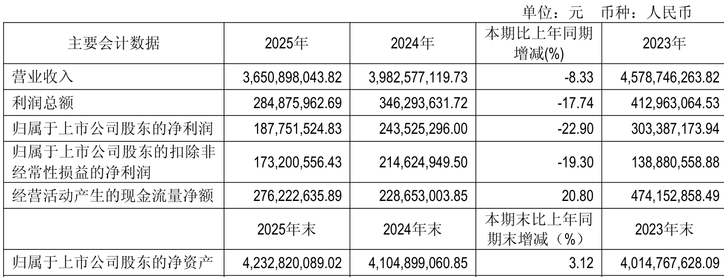 中证智能财讯福瑞达(600223)4月3日披露2025年年度报告。2025年,公司实现营业总收入36.51亿元,同比下降8.33%;归母净利润1.88亿元,同比下降22.90%;扣非净利润1.73亿元,同比下降19.30%;经营活动产生的现金流量净额为2.76亿元,同比增长20.80%;报告期内,福瑞达基本每股收益为0.18元,加权平均净资产收益率为4.50%。公司2025年度分配预案为:拟向全体股东每10股派现0.57元(含税)。