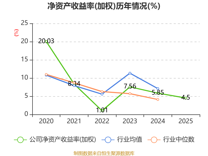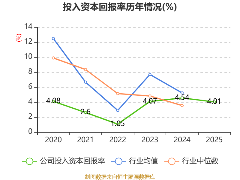 数据显示,2025年公司加权平均净资产收益率为4.5%,较上年同期下降1.35个百分点。公司2025年投入资本回报率为4.01%,较上年同期下降0.53个百分点。