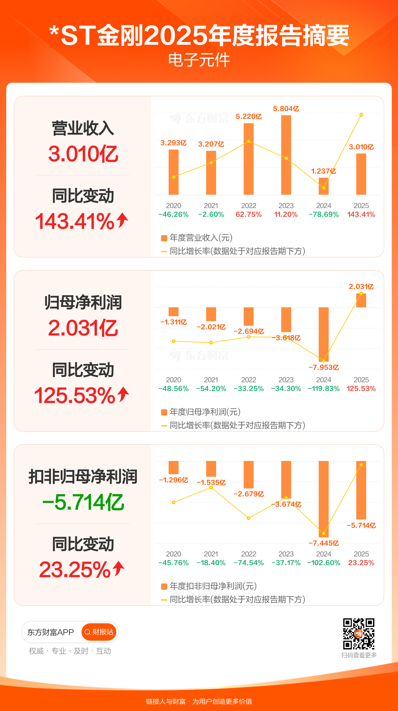 *ST金刚4月3日发布2025年年报显示,公司全年实现营业收入3.01亿元,同比增长143.41%;归母净利润2.03亿元,同比增长125.53%;扣非归母净利润-5.71亿元。