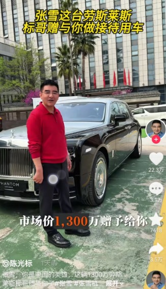 “张雪,你好,我是陈光标。你太牛了!带着中国机车在世界顶级赛场连续拿了两个冠军,打破了国外几十年的垄断,这是咱们中国制造的骄傲,我看得热血沸腾。”陈光标在4月1日发布的视频中称,为了表彰张雪为国争光、做出贡献,“标哥决定将公司刚购买的”中国唯一一辆2026款加长劳斯莱斯幻影“赠与张雪,并称其市场价为1300万元,”作为张雪老弟的接待用车。