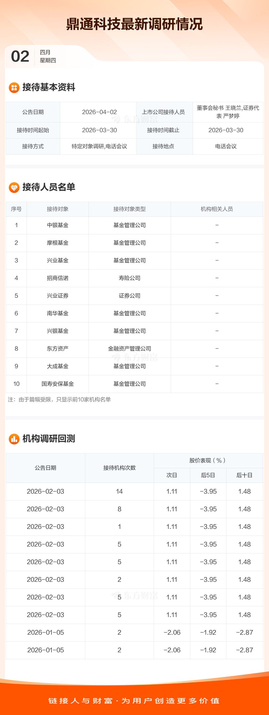 鼎通科技4月2日公告称,3月30日接待中银基金等41家机构调研。接待人员包括董事会秘书 王晓兰,证券代表 严梦婷。