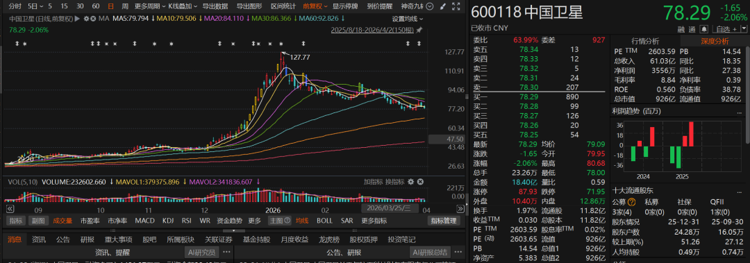 2025年四季度开始,卫星板块站上风口,作为龙头的中国卫星,在短短几个月内,股价最高飙涨两倍多,市值一度高达1500亿元。
