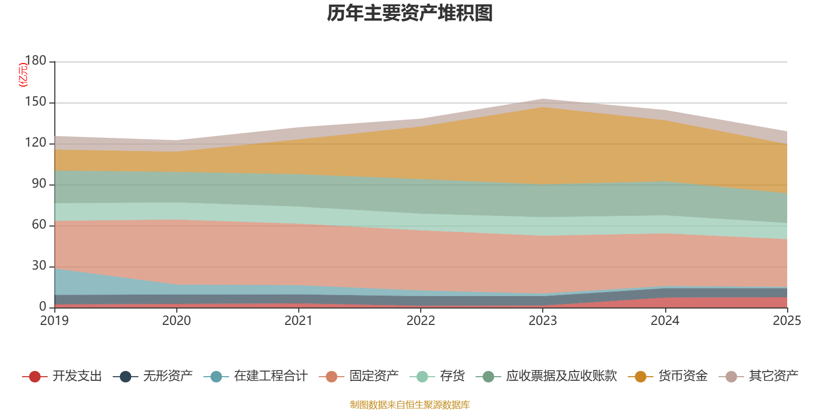 资产重大变化方面,截至2025年末,公司货币资金较上年末减少19.39%,占公司总资产比重下降2.99个百分点;应收款项融资占公司总资产的1.9%,上年末为0;开发支出较上年末增加3.95%,占公司总资产比重上升0.82个百分点;应收票据及应收账款较上年末减少12.83%,占公司总资产比重下降0.4个百分点。