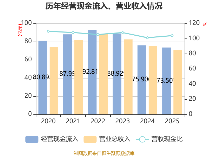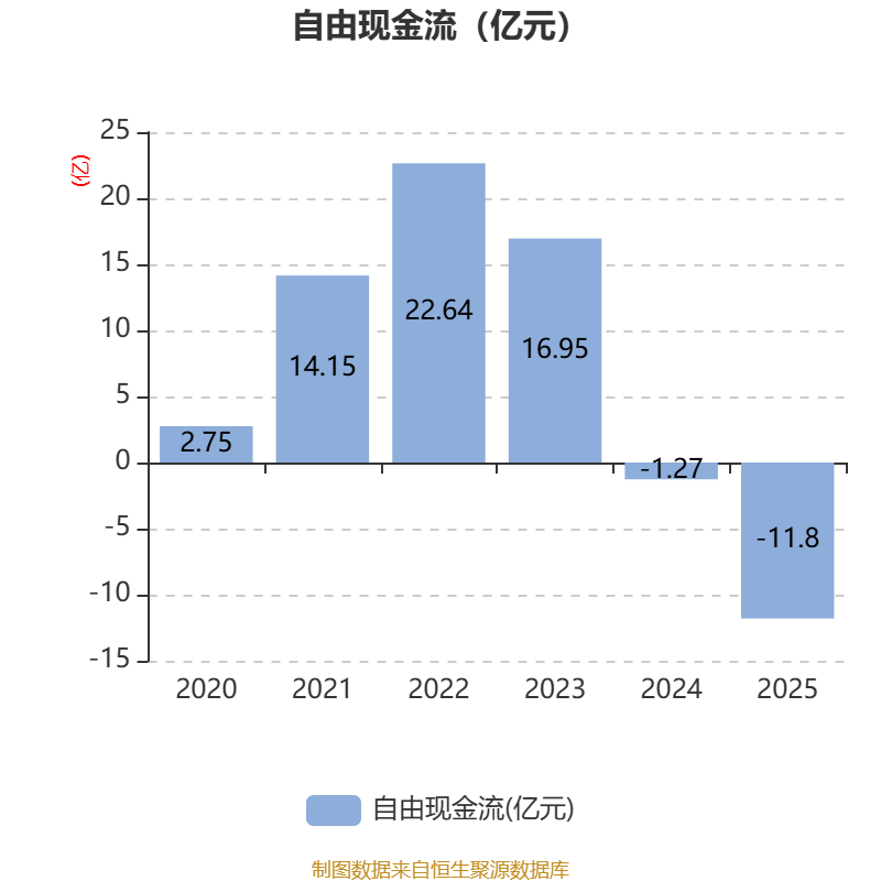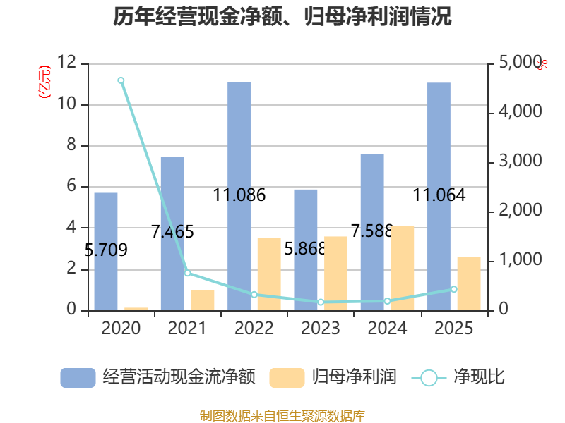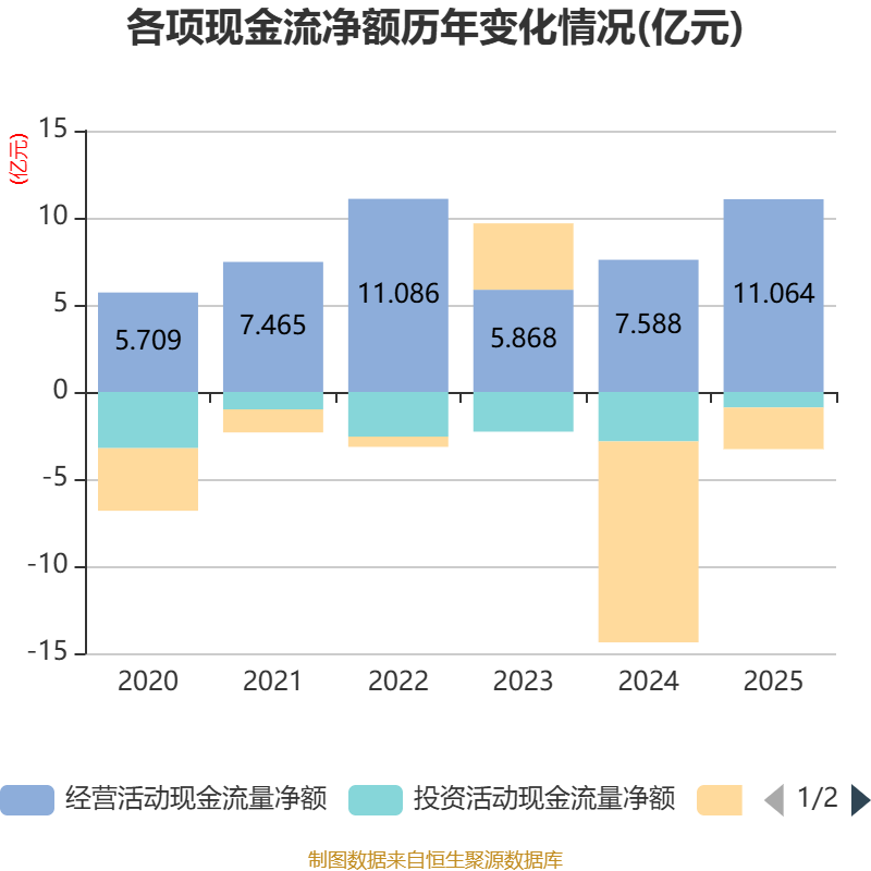 截至2025年,公司经营活动现金流净额为11.06亿元,同比增长45.81%;筹资活动现金流净额-2.39亿元,同比增加9.14亿元;投资活动现金流净额-8936.66万元,上年同期为-2.84亿元。