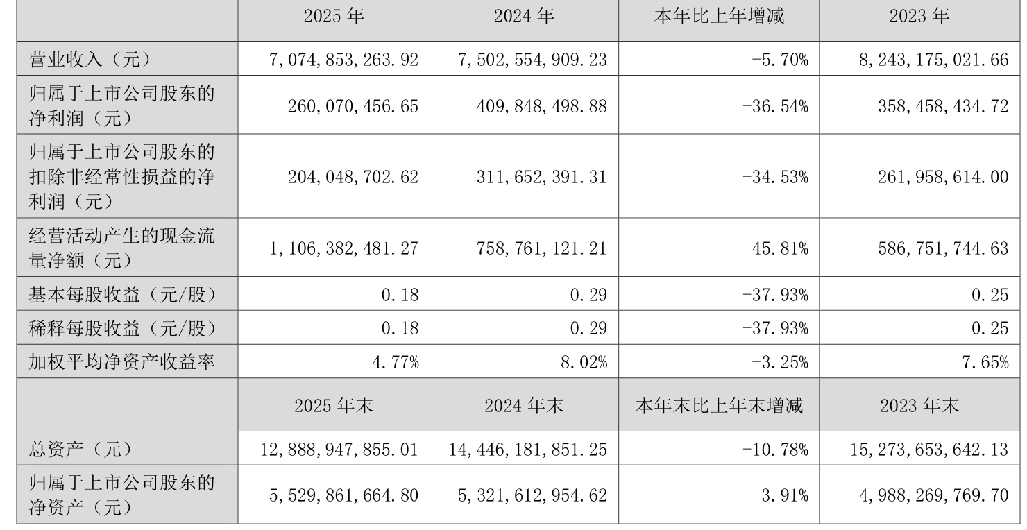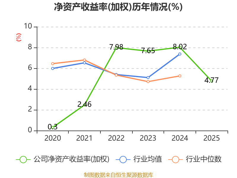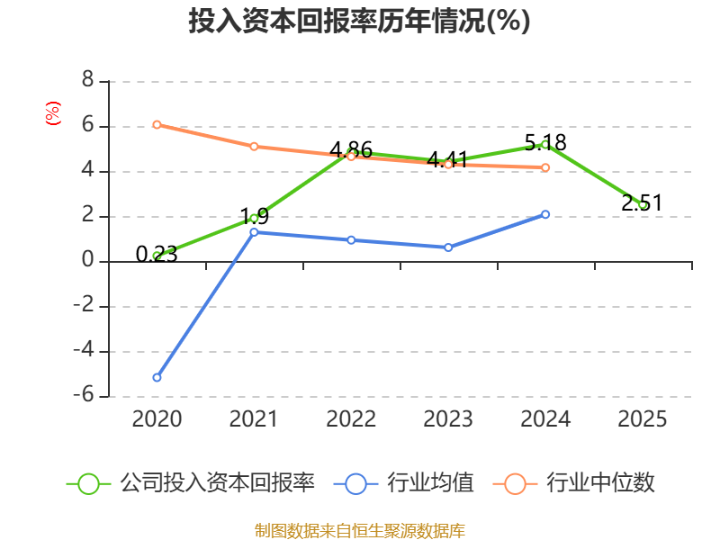 数据显示,2025年公司加权平均净资产收益率为4.77%,较上年同期下降3.25个百分点。公司2025年投入资本回报率为2.51%,较上年同期下降2.67个百分点。