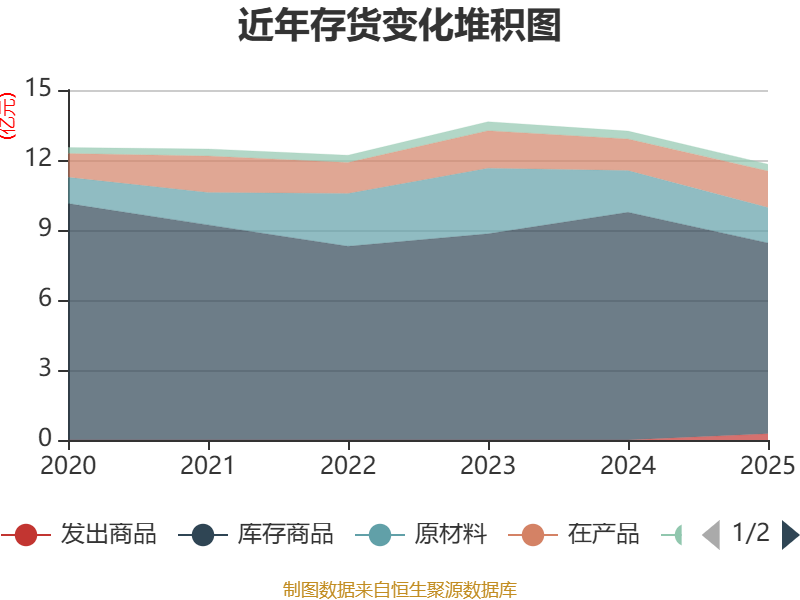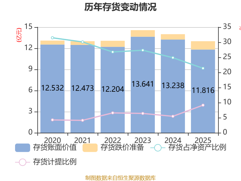 从存货变动来看,截至2025年末,公司存货账面价值为11.82亿元,占净资产的21.37%,较上年末减少1.42亿元。其中,存货跌价准备为1.19亿元,计提比例为9.14%。