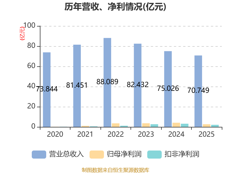 中证智能财讯东北制药(000597)4月3日披露2025年年度报告。2025年,公司实现营业总收入70.75亿元,同比下降5.70%;归母净利润2.6亿元,同比下降36.54%;扣非净利润2.04亿元,同比下降34.53%;经营活动产生的现金流量净额为11.06亿元,同比增长45.81%;报告期内,东北制药基本每股收益为0.18元,加权平均净资产收益率为4.77%。公司2025年度分配预案为:拟向全体股东每10股派现0.55元(含税)。