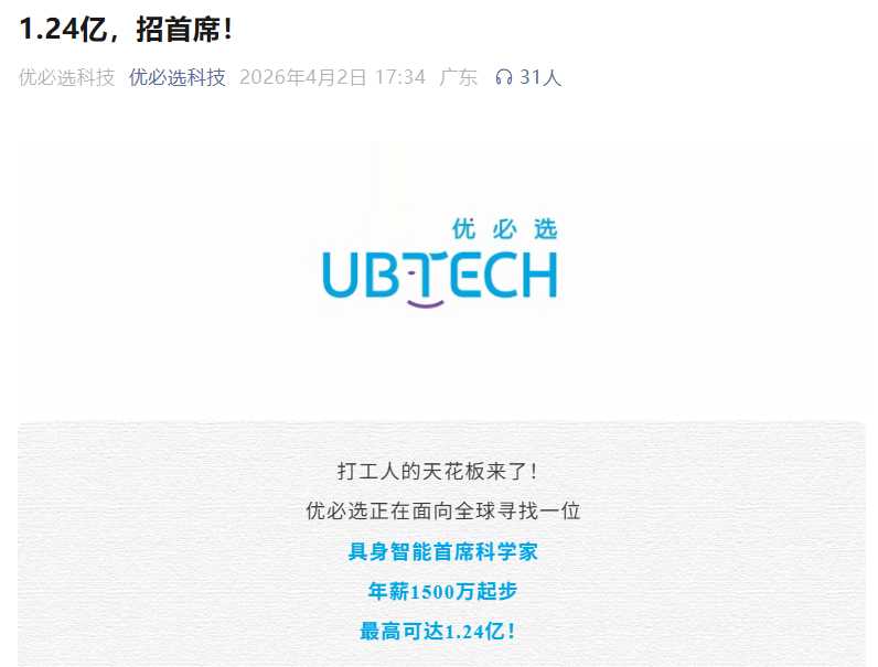 4月2日,港股机器人企业优必选在微信公众号发文,面向全球寻找一位具身智能首席科学家,年薪1500万元起步,最高可达1.24亿元。