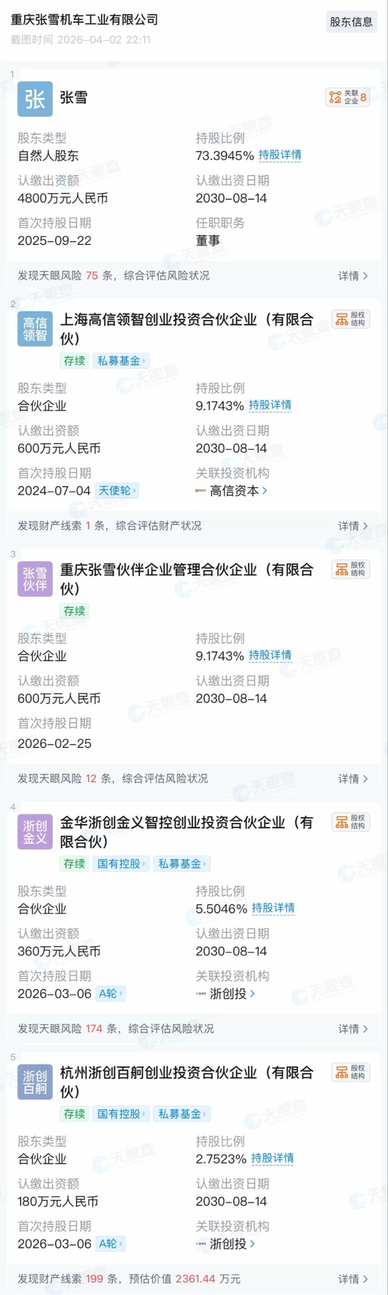 成立于2024年4月2日的重庆张雪机车工业有限公司(以下简称“张雪机车”)共拿到两笔投资。2024年7月高信资本名下基金上海高信领智创业投资合伙企业(有限合伙)投资了2000万元,持股约9.17%。2026年1月,浙江省国有资本运营有限公司旗下浙江省创业投资集团有限公司(以下简称“浙创投”)通过两只基金(杭州浙创百舸、金华浙创金义智控)完成对张雪机车的A轮投资,投资总额9000万元,估值一举推至10.9亿元。